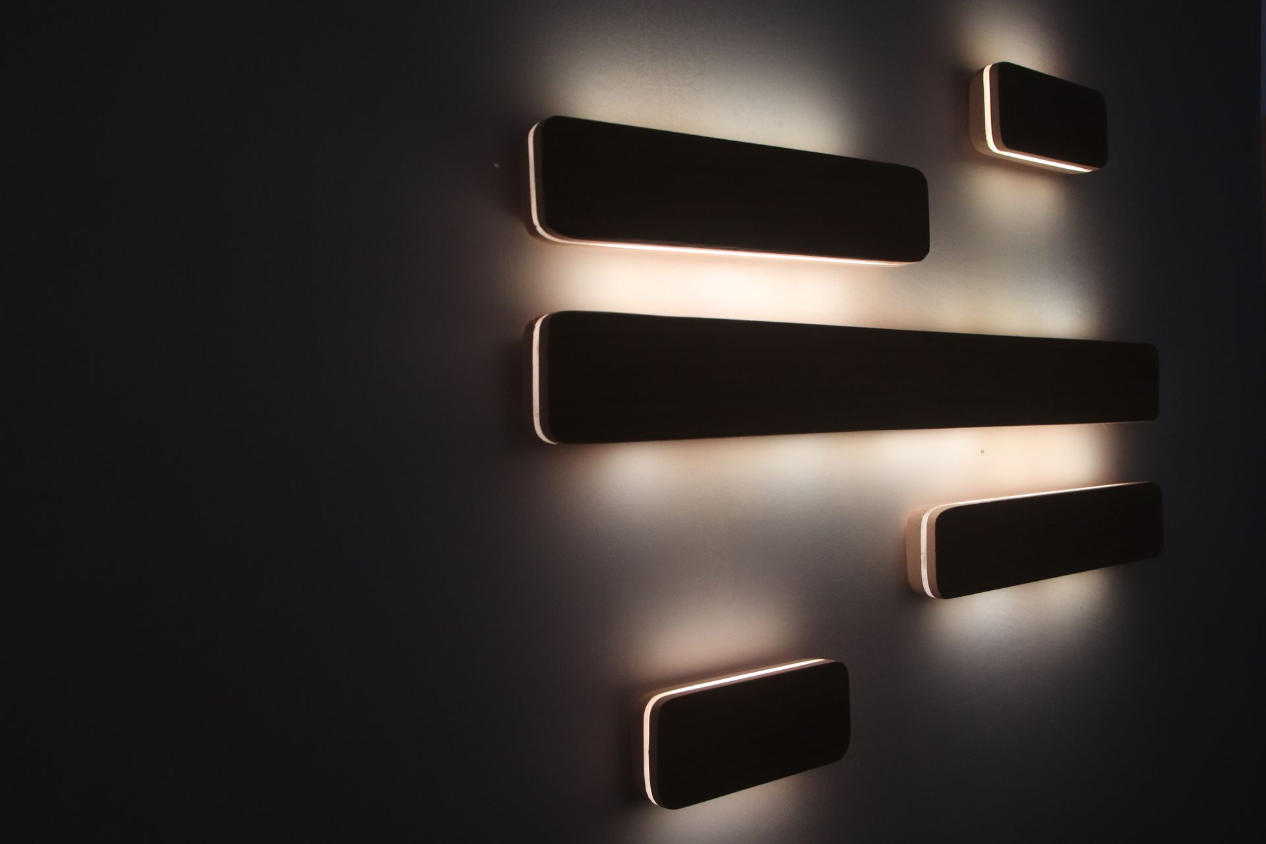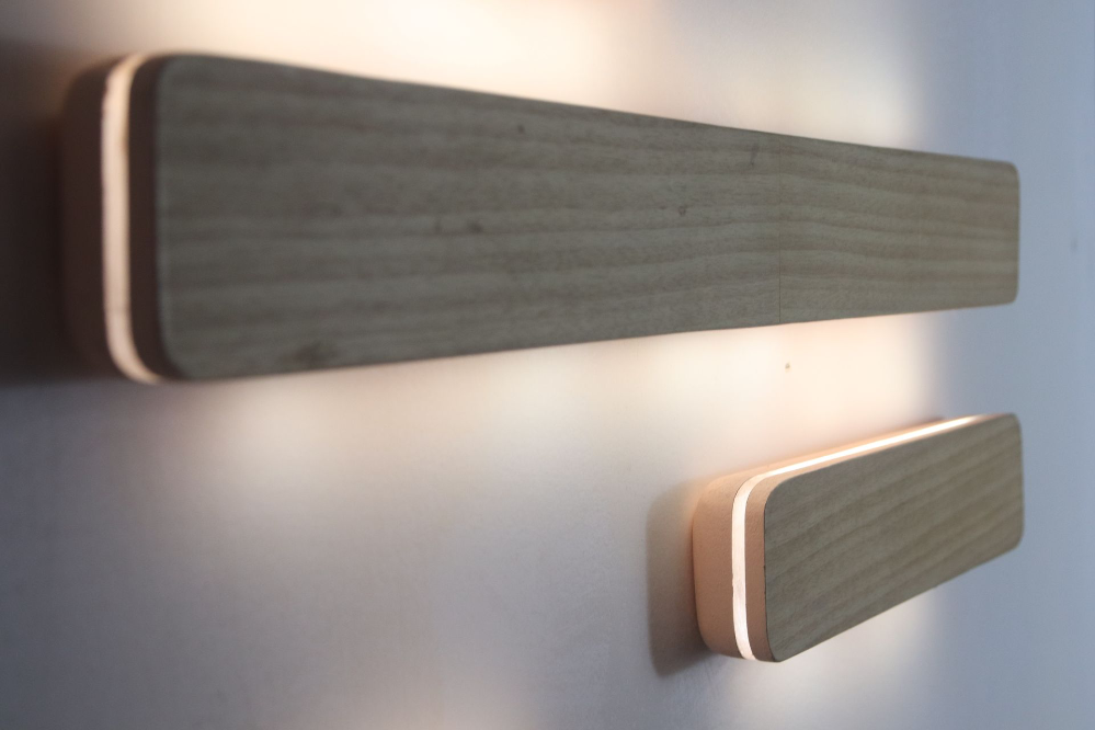 Les luminaires muraux Kosei sont conçus pour diffuser la lumière indirectement grâce à un panneau en plexiglas qui projette un halo latéral sur le mur. Ce principe permet d’obtenir un éclairage d’ambiance doux, sans source lumineuse apparente, idéal pour structurer un espace avec subtilité. La structure est réalisée en contreplaqué peint, associée à un placage de charme qui apporte une dimension naturelle et chaleureuse. L’équilibre entre surface colorée, veinage du bois et diffusion lumineuse crée un contraste maîtrisé entre matière et lumière.