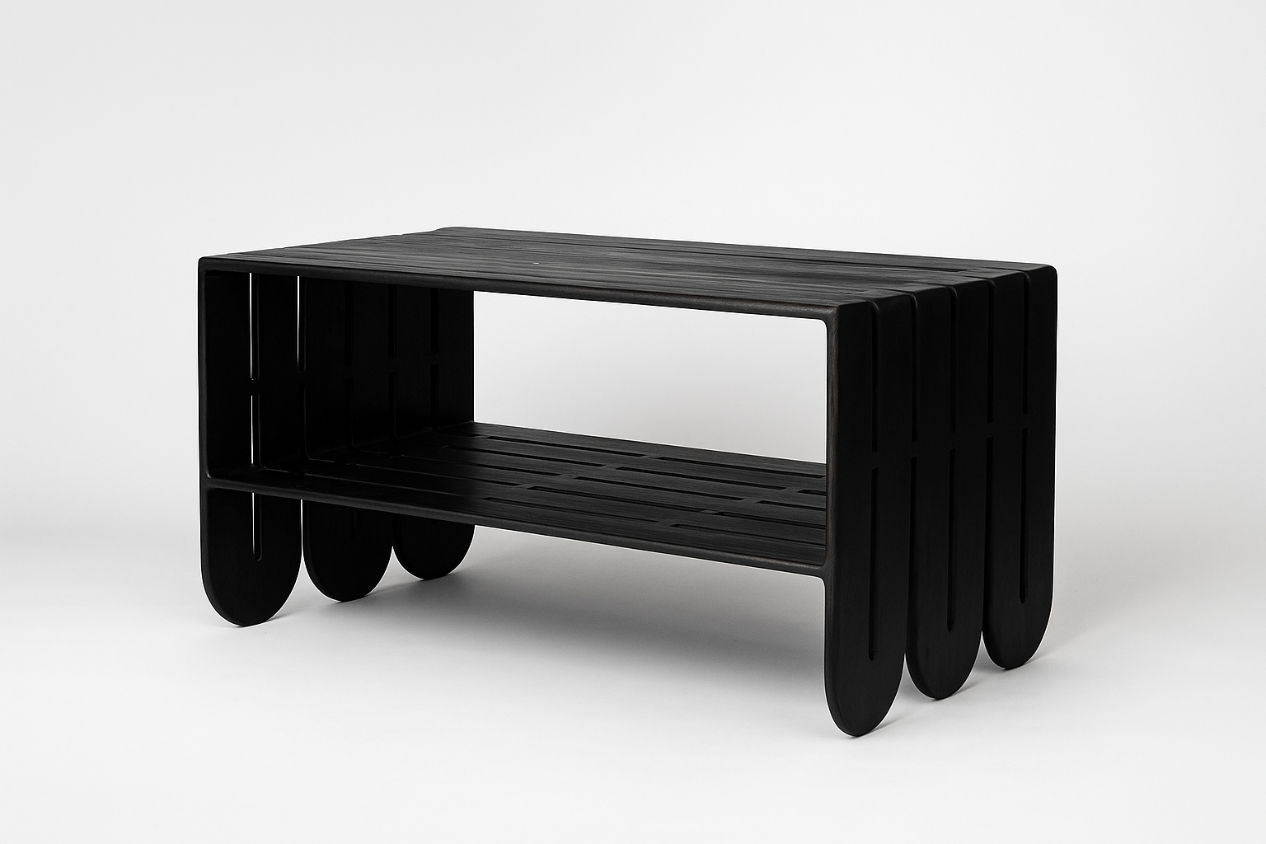 Le noir ne masque pas la matière, il la sublime. Il renforce la dimension graphique de l’ensemble et lui confère une élégance presque architecturale. À la croisée du mobilier et de la sculpture, elle dépasse sa simple fonction pour devenir un point d’ancrage visuel. À la fois fonctionnelle et expressive, elle trouve naturellement sa place dans un intérieur minimaliste, où elle structure l’espace, comme dans un décor plus affirmé, auquel elle apporte profondeur et caractère.